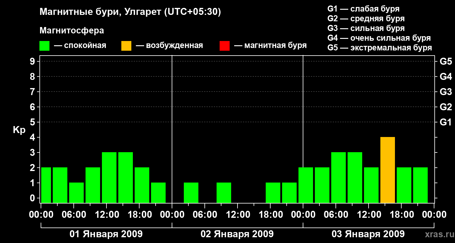 Изменения геомагнитного индекса Kp с 1 по 3 января 2009 года для средних широт