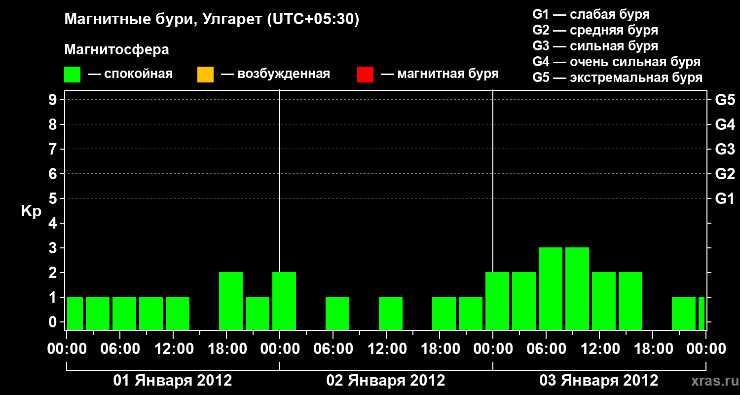 Изменения геомагнитного индекса Kp с 1 по 3 января 2012 года для средних широт
