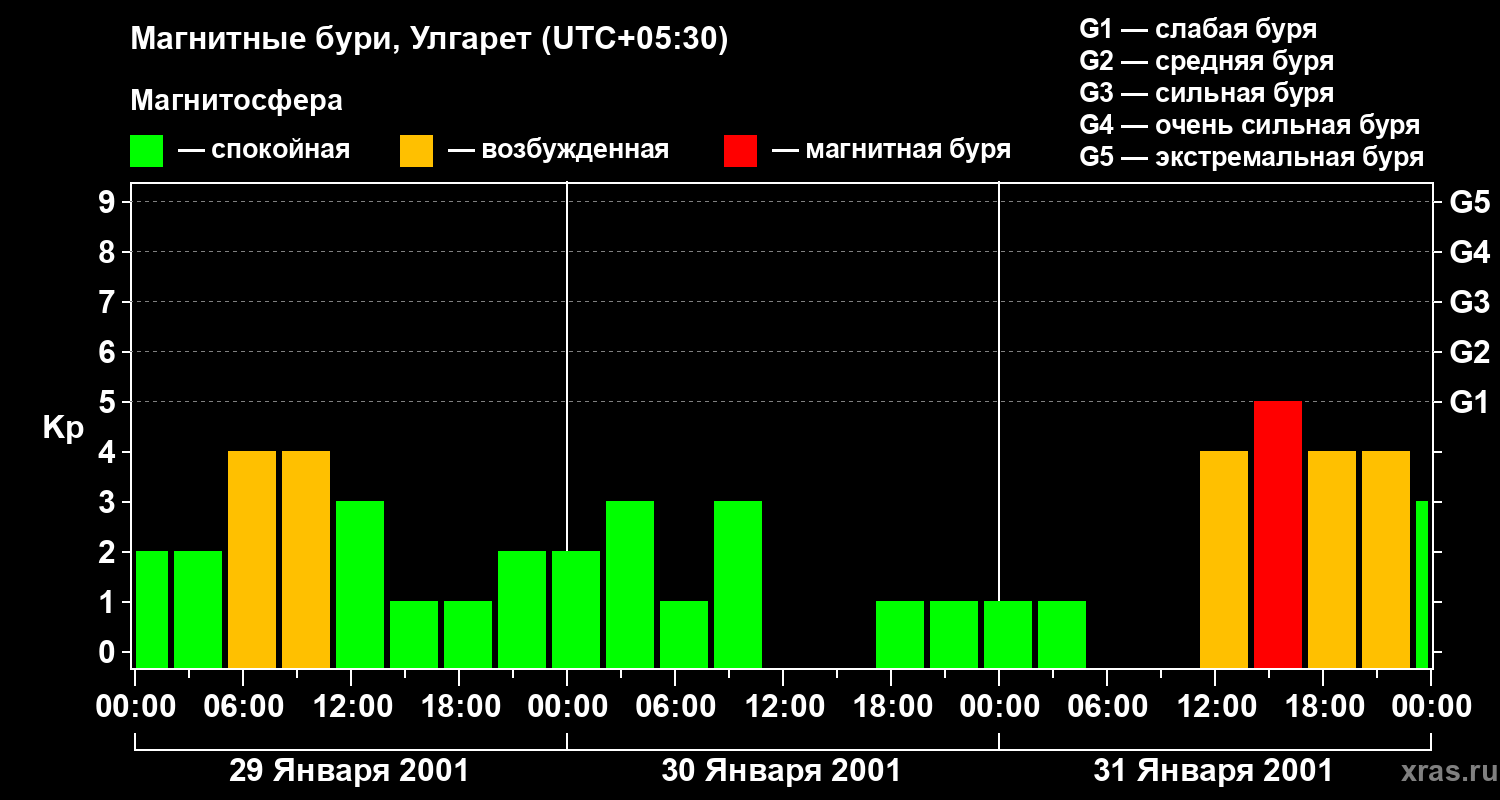 Изменения геомагнитного индекса Kp с 29 по 31 января 2001 года для средних широт