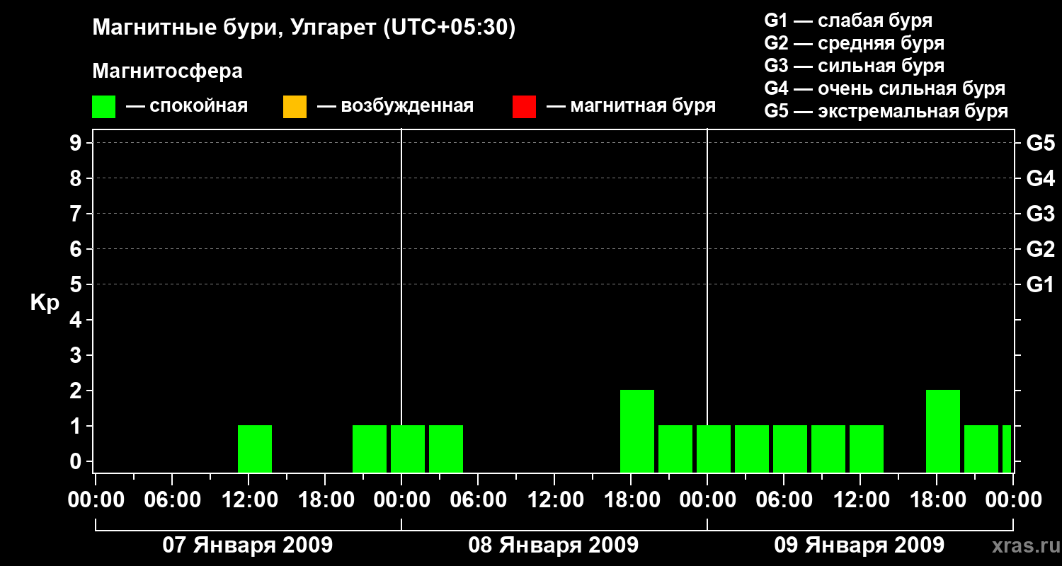 Изменения геомагнитного индекса Kp с 7 по 9 января 2009 года для средних широт