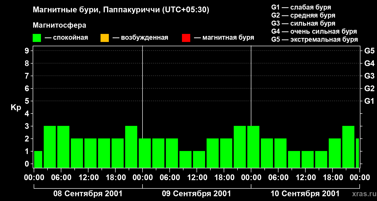 Изменения геомагнитного индекса Kp с 8 по 10 сентября 2001 года для средних широт