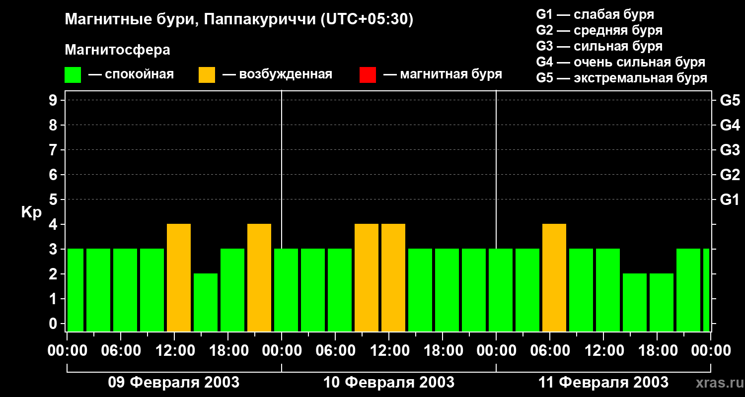 Изменения геомагнитного индекса Kp с 9 по 11 февраля 2003 года для средних широт
