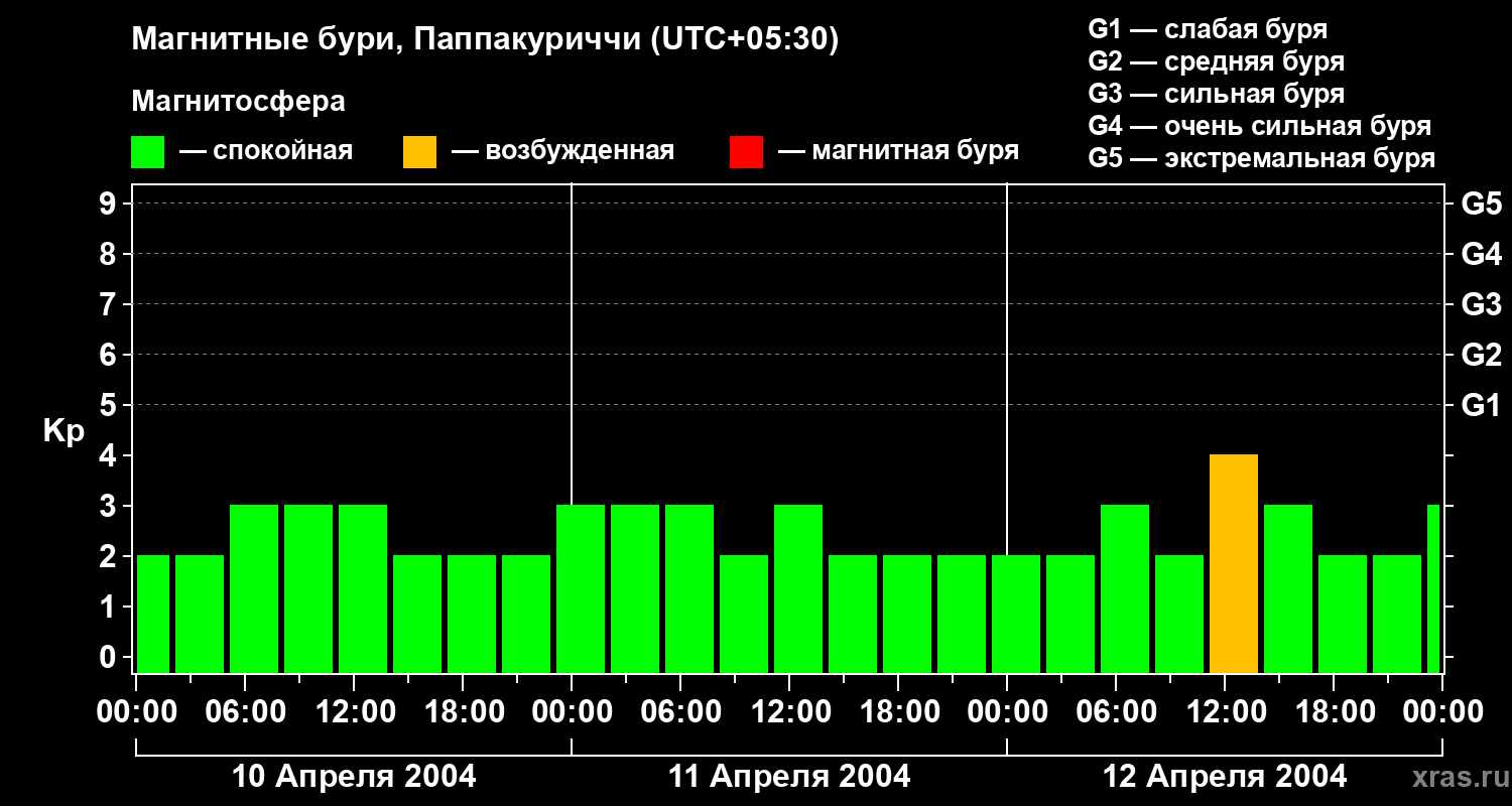 Изменения геомагнитного индекса Kp с 10 по 12 апреля 2004 года для средних широт