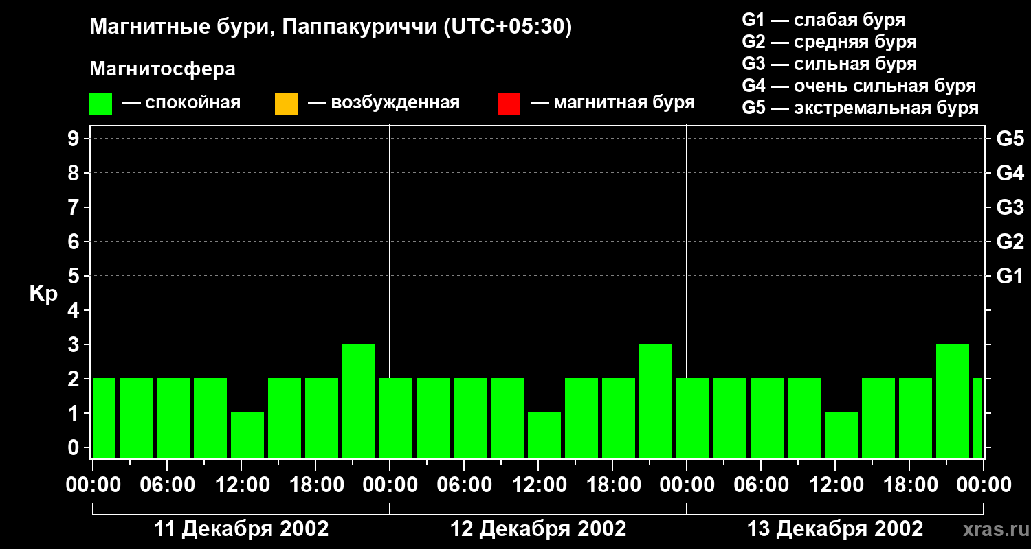 Изменения геомагнитного индекса Kp с 11 по 13 декабря 2002 года для средних широт