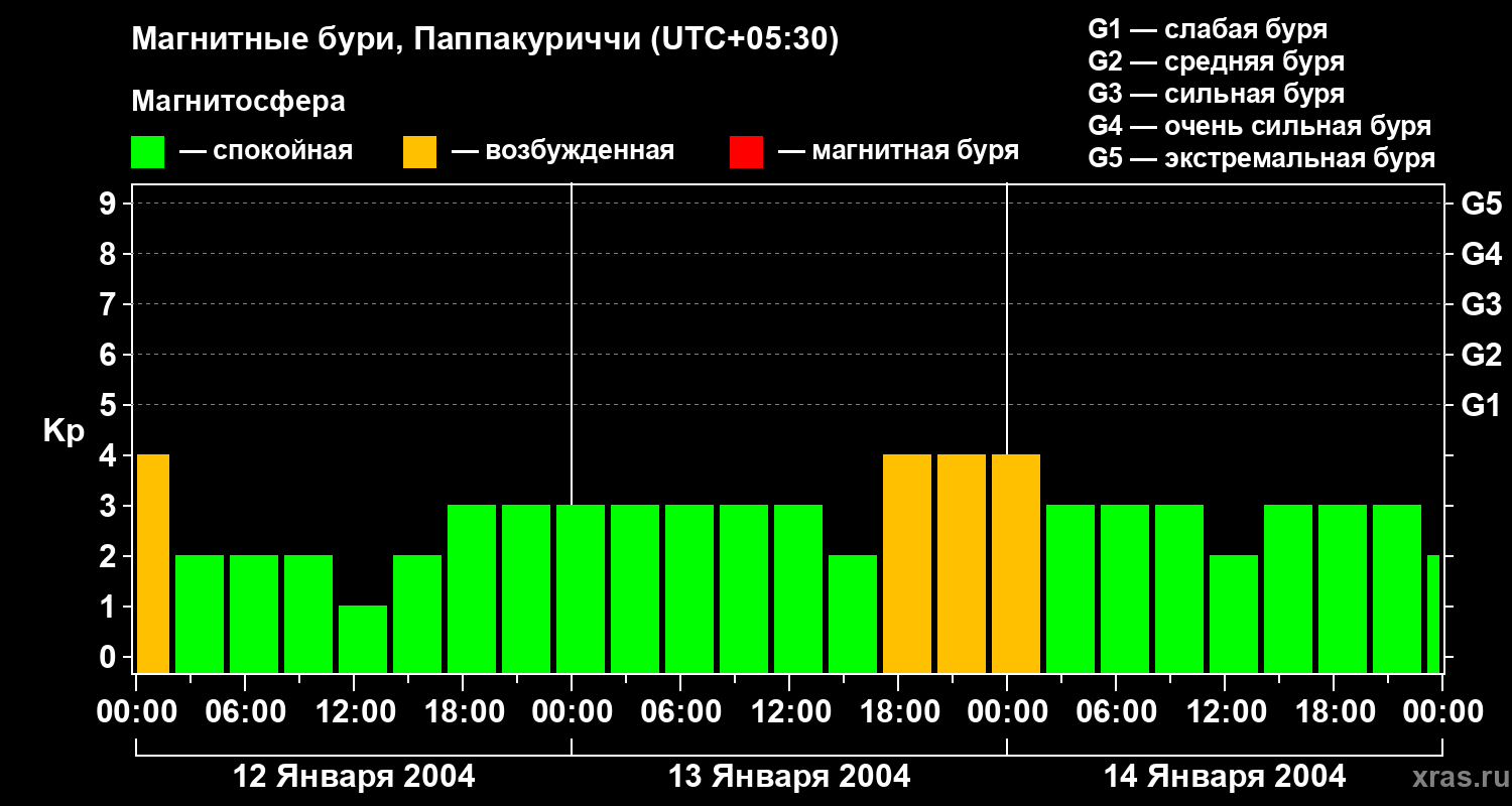 Изменения геомагнитного индекса Kp с 12 по 14 января 2004 года для средних широт