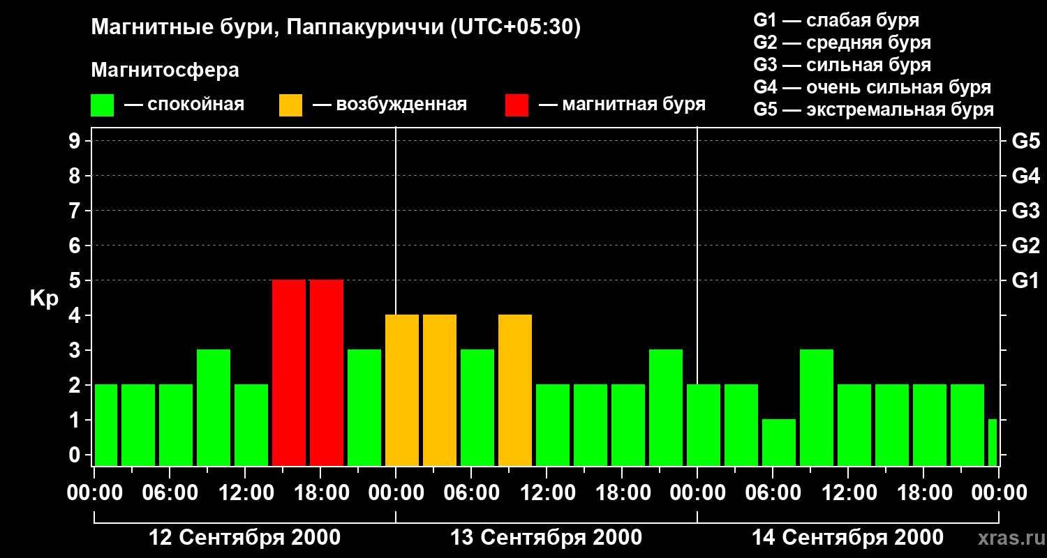 Изменения геомагнитного индекса Kp с 12 по 14 сентября 2000 года для средних широт