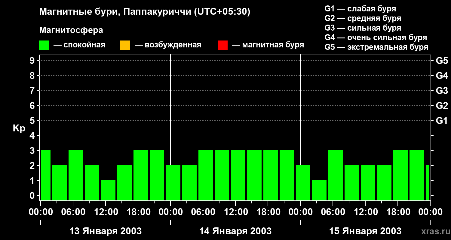 Изменения геомагнитного индекса Kp с 13 по 15 января 2003 года для средних широт