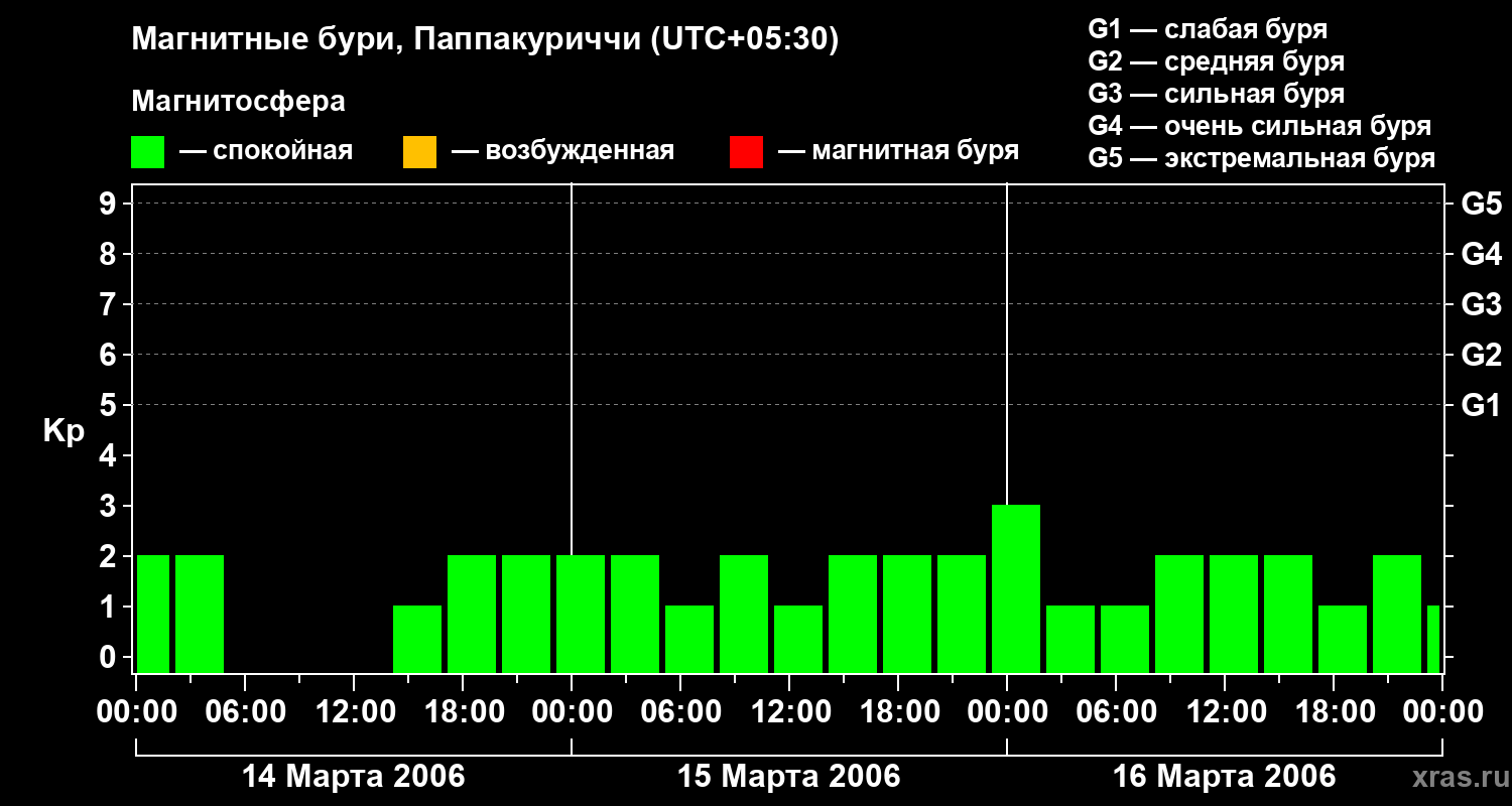 Изменения геомагнитного индекса Kp с 14 по 16 марта 2006 года для средних широт