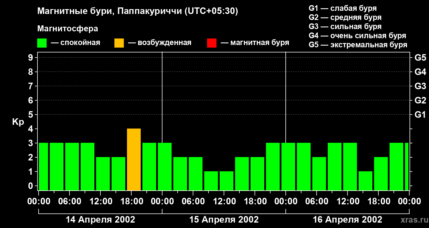 Изменения геомагнитного индекса Kp с 14 по 16 апреля 2002 года для средних широт