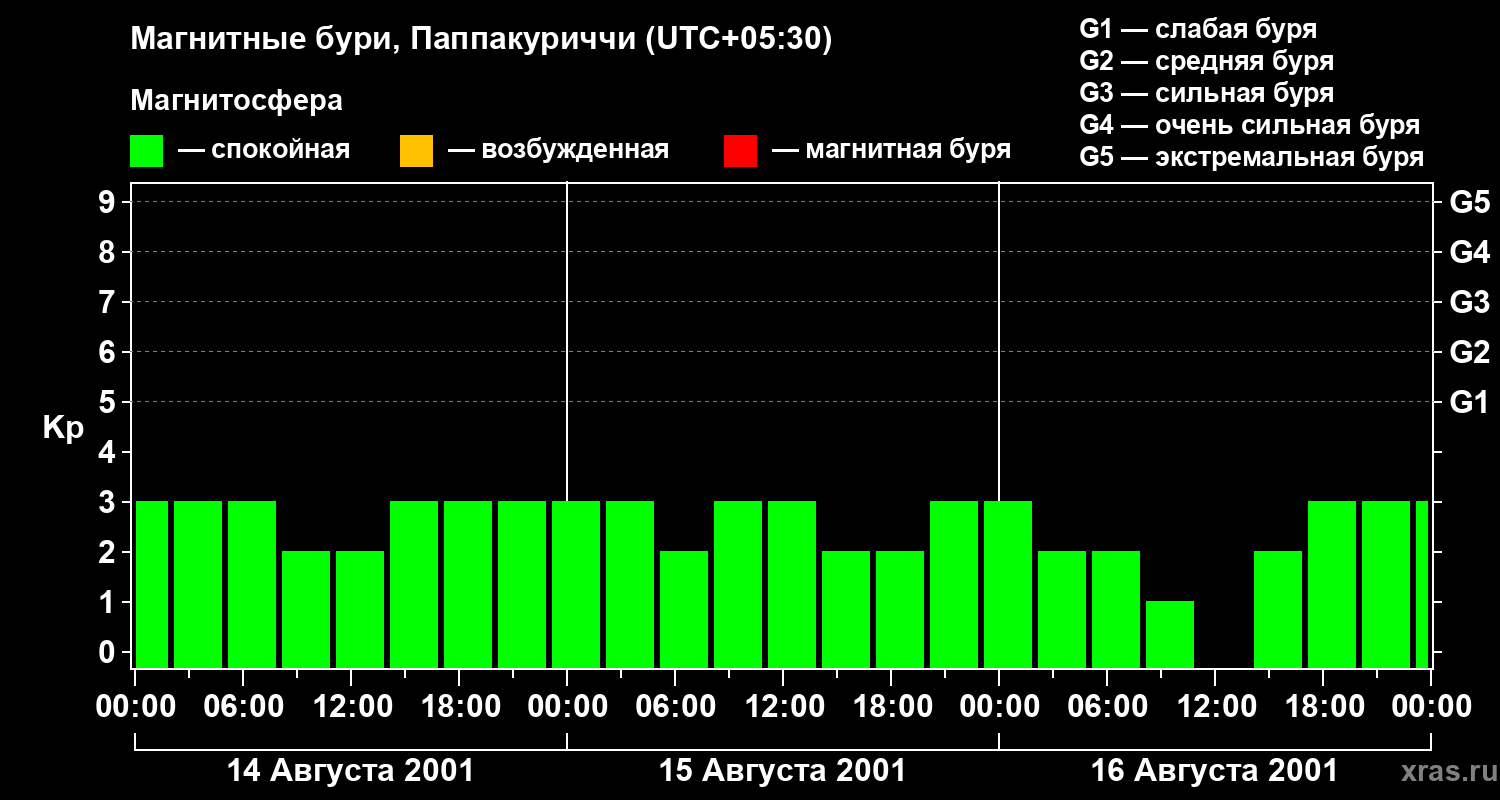 Изменения геомагнитного индекса Kp с 14 по 16 августа 2001 года для средних широт