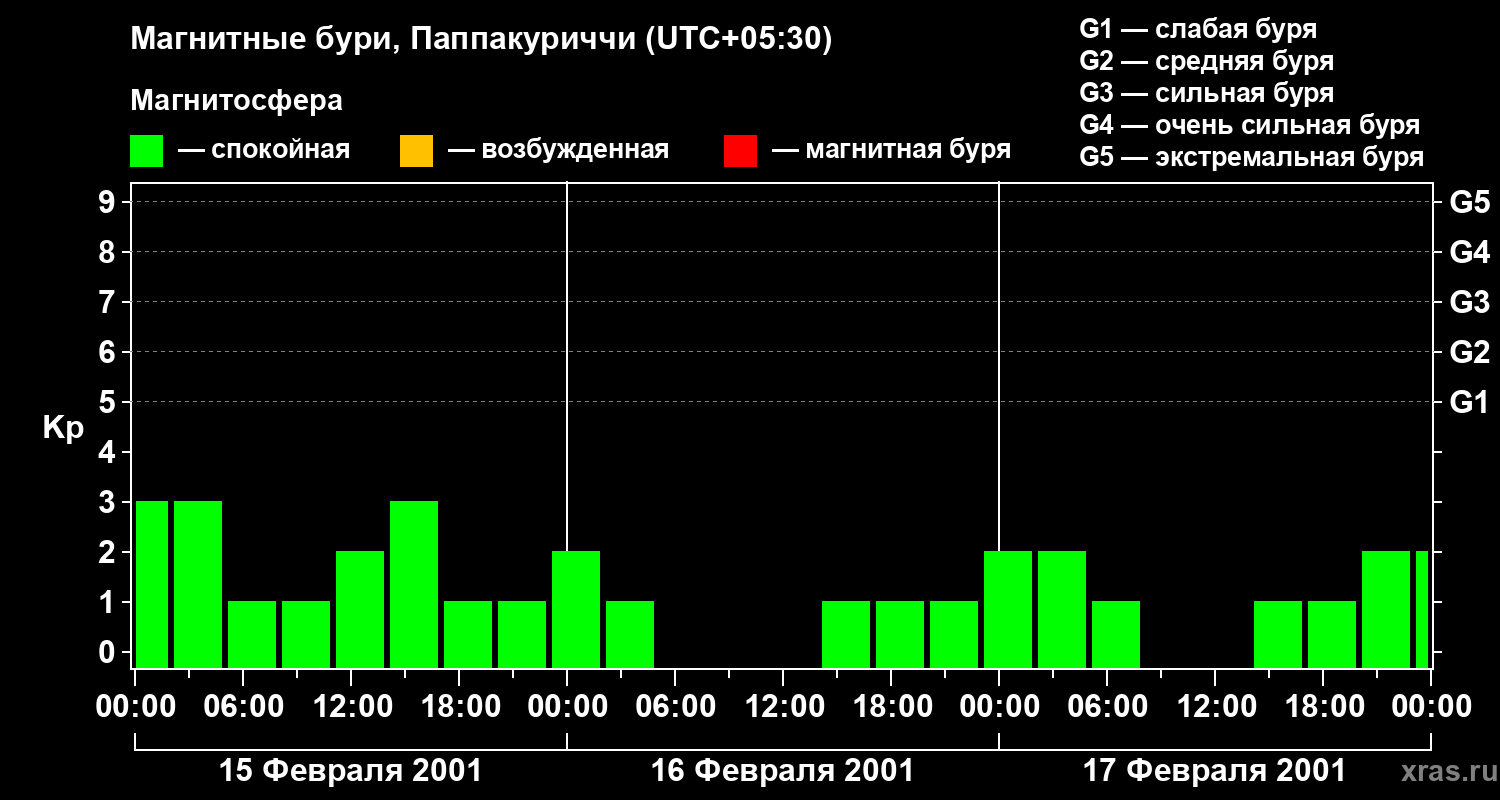 Изменения геомагнитного индекса Kp с 15 по 17 февраля 2001 года для средних широт
