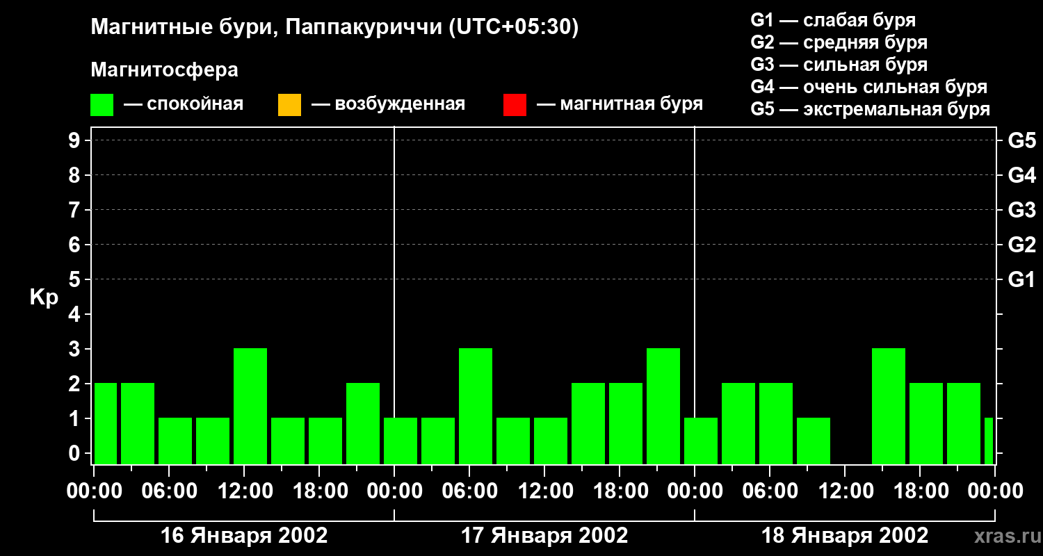 Изменения геомагнитного индекса Kp с 16 по 18 января 2002 года для средних широт