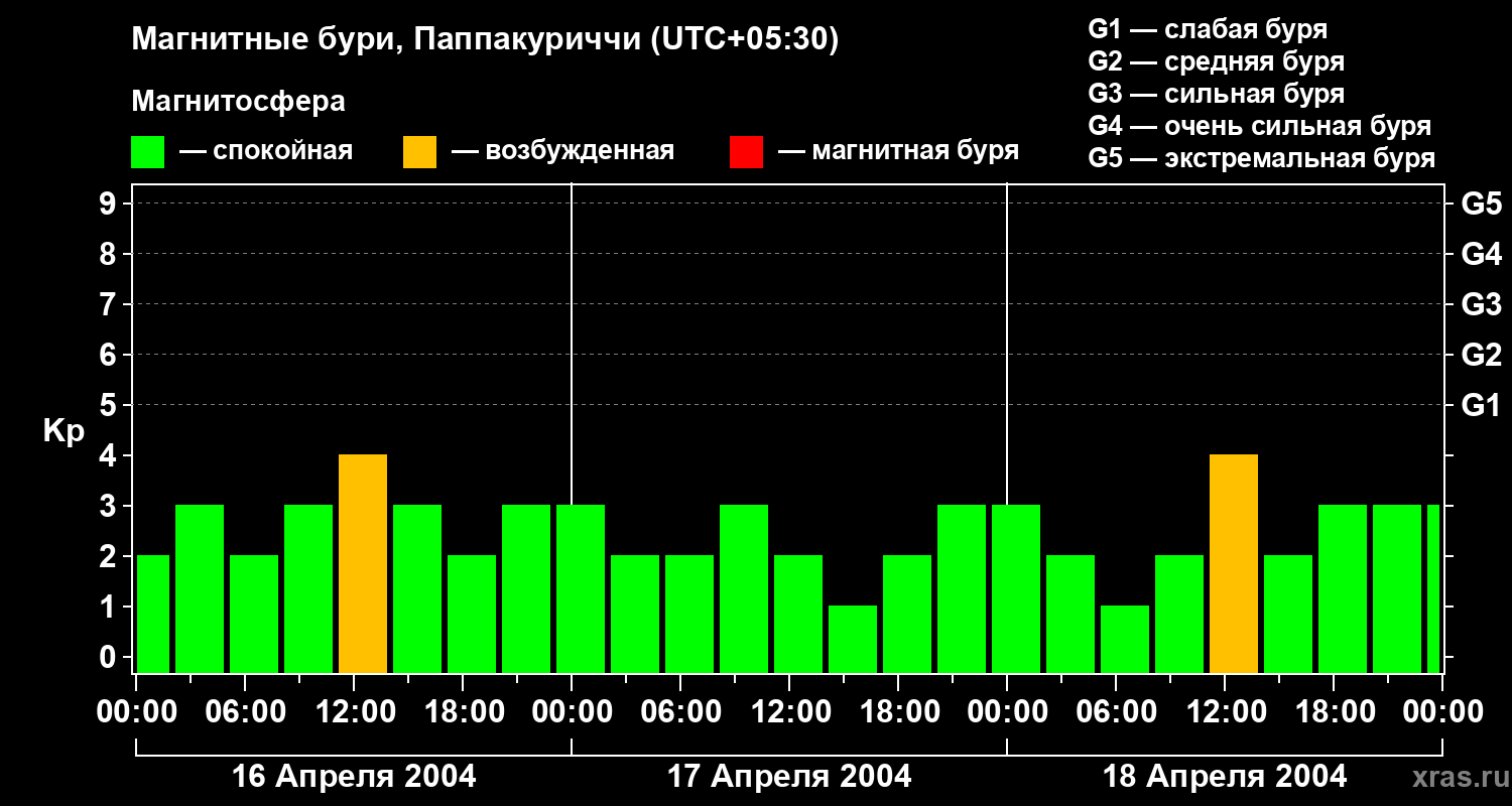 Изменения геомагнитного индекса Kp с 16 по 18 апреля 2004 года для средних широт