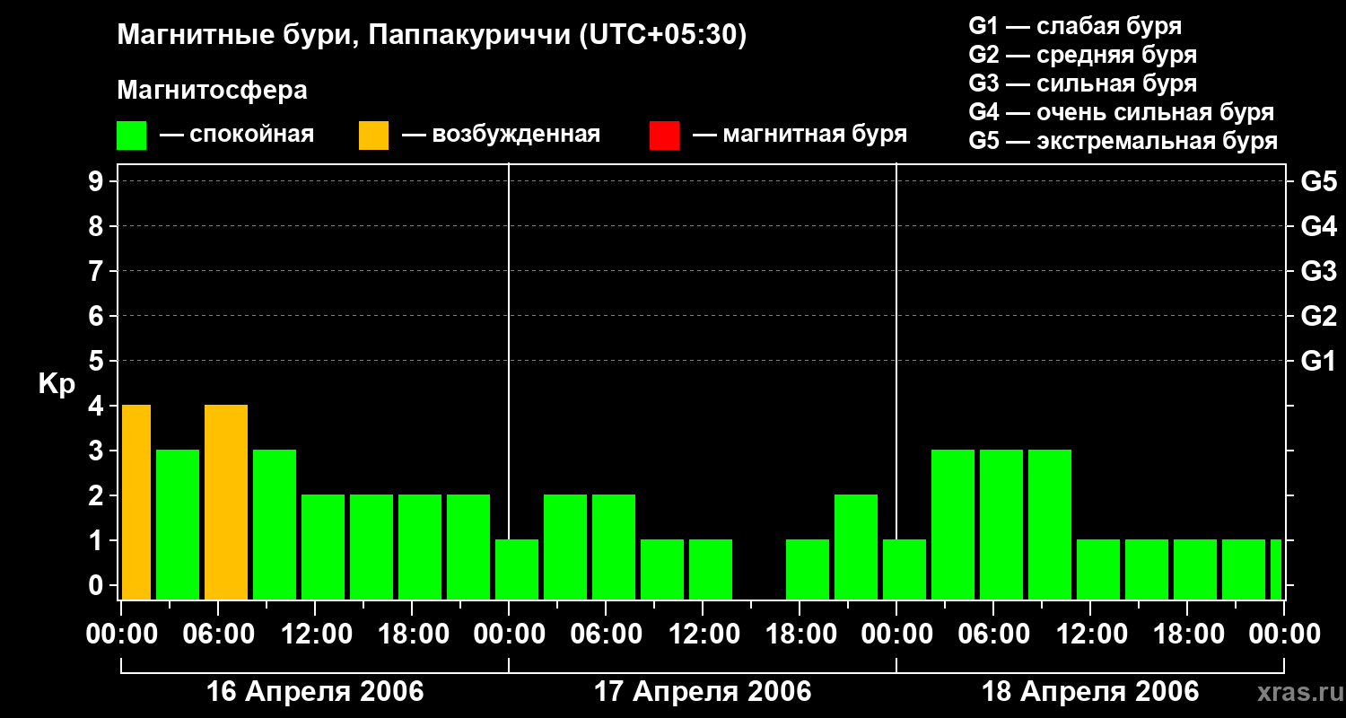 Изменения геомагнитного индекса Kp с 16 по 18 апреля 2006 года для средних широт