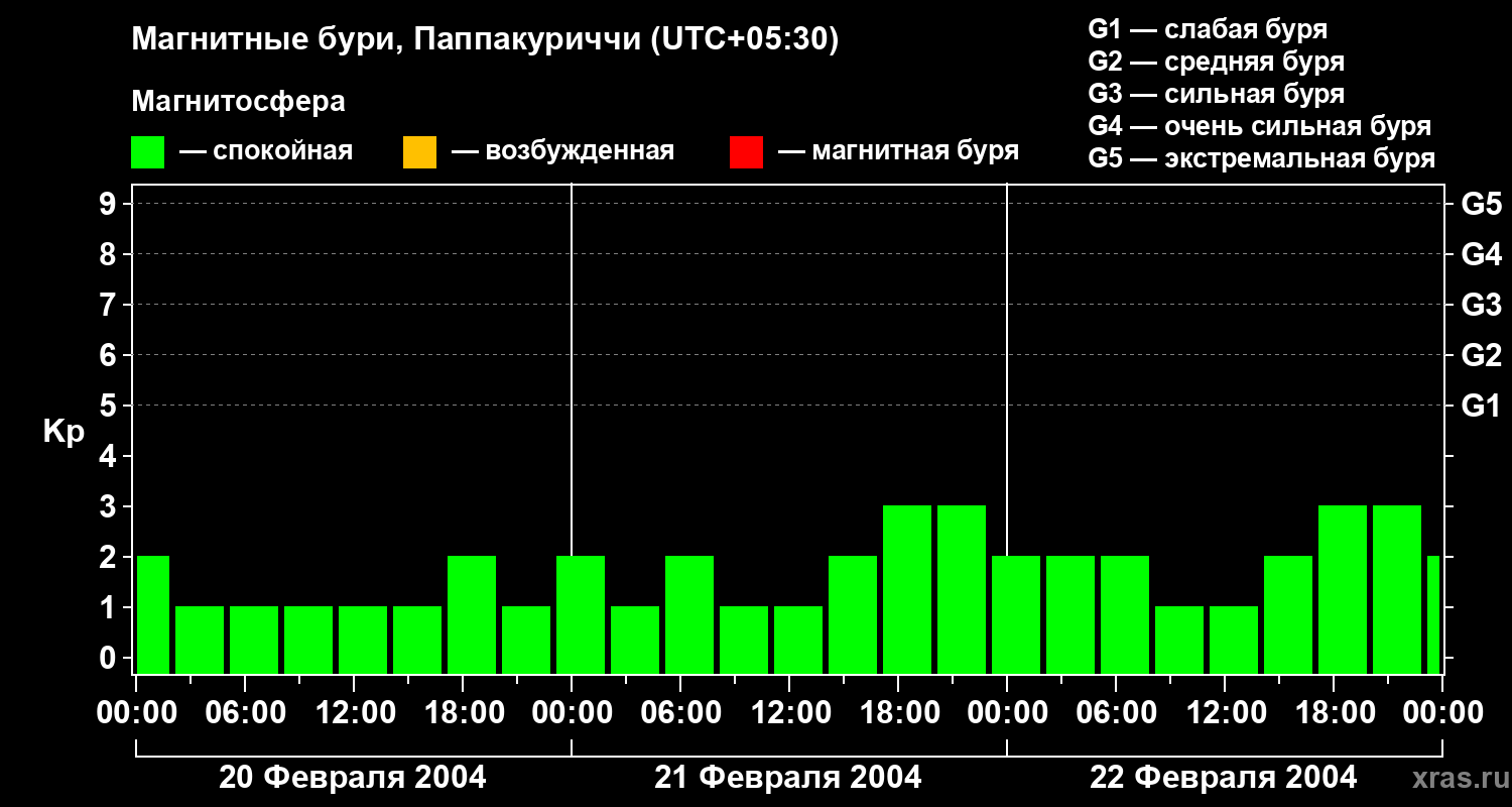 Изменения геомагнитного индекса Kp с 20 по 22 февраля 2004 года для средних широт