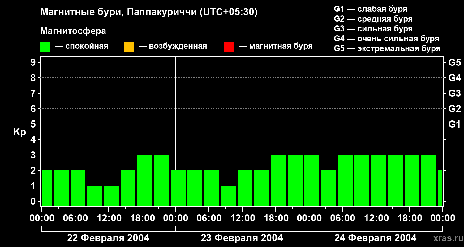 Изменения геомагнитного индекса Kp с 22 по 24 февраля 2004 года для средних широт