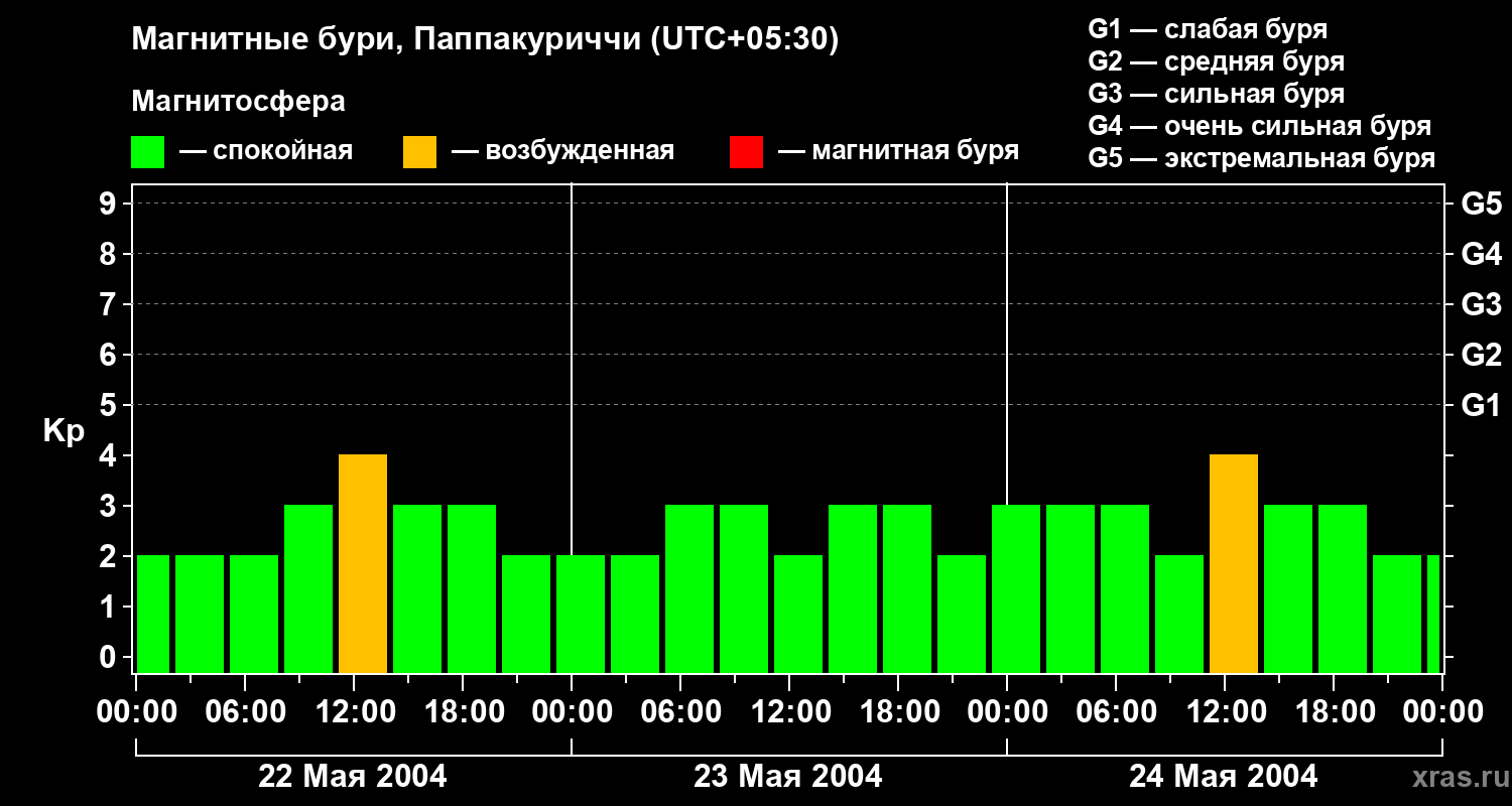 Изменения геомагнитного индекса Kp с 22 по 24 мая 2004 года для средних широт