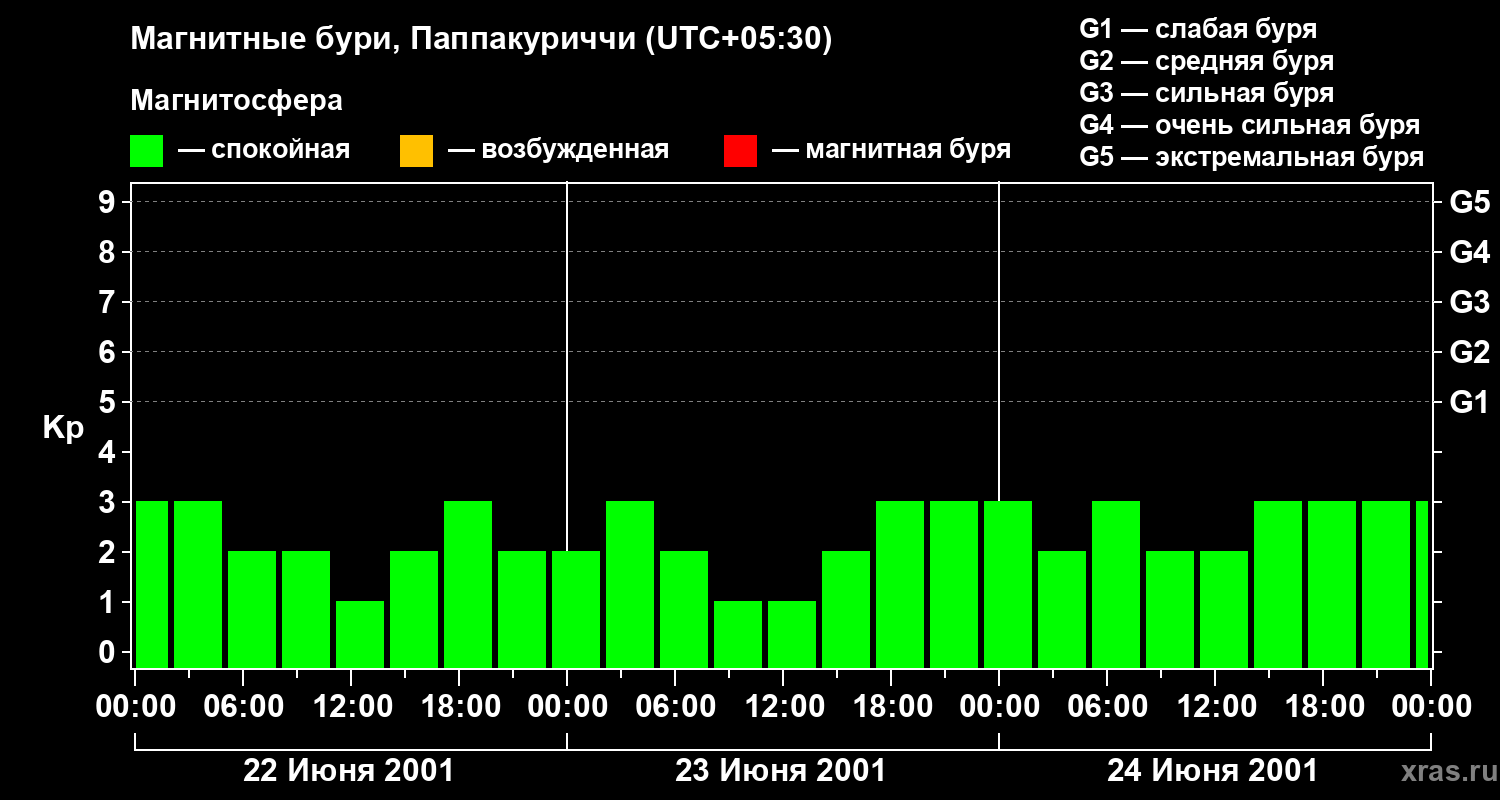 Изменения геомагнитного индекса Kp с 22 по 24 июня 2001 года для средних широт