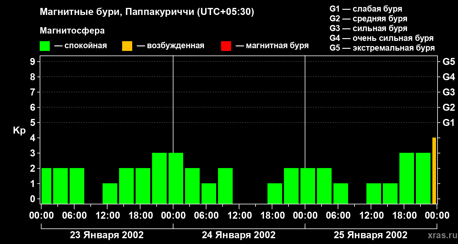Изменения геомагнитного индекса Kp с 23 по 25 января 2002 года для средних широт