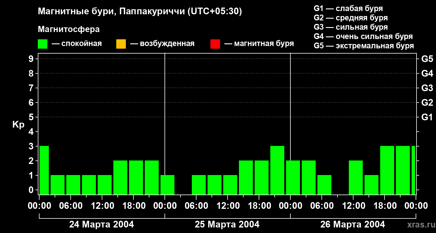 Изменения геомагнитного индекса Kp с 24 по 26 марта 2004 года для средних широт