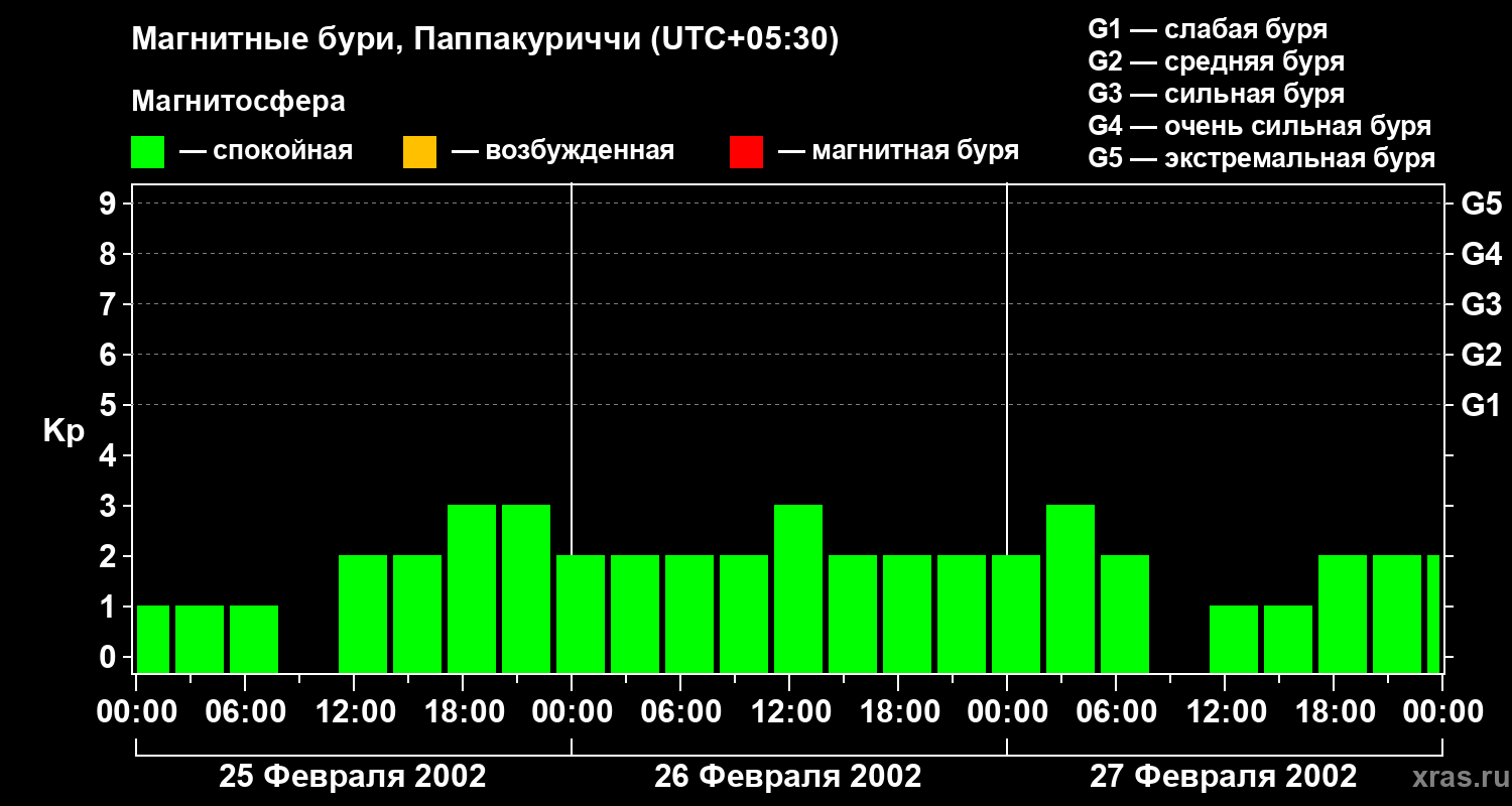 Изменения геомагнитного индекса Kp с 25 по 27 февраля 2002 года для средних широт