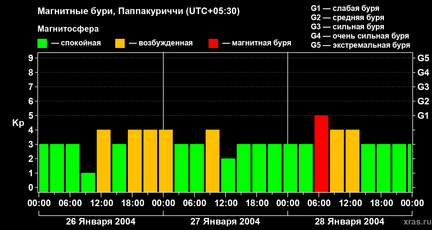 Изменения геомагнитного индекса Kp с 26 по 28 января 2004 года для средних широт