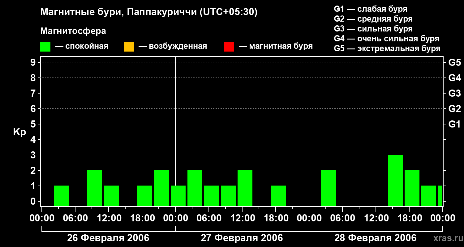 Изменения геомагнитного индекса Kp с 26 по 28 февраля 2006 года для средних широт