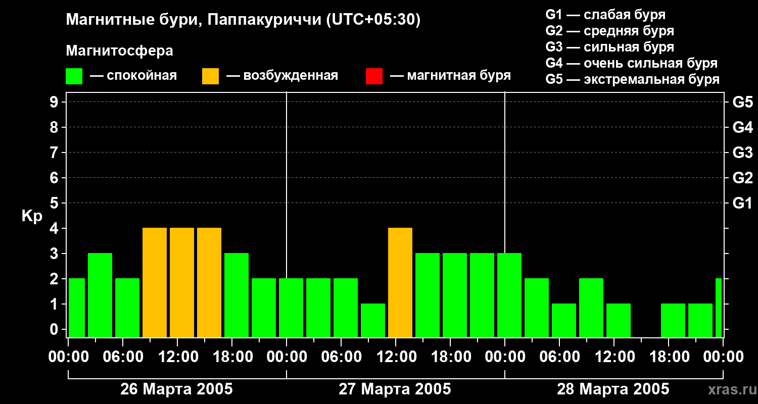 Изменения геомагнитного индекса Kp с 26 по 28 марта 2005 года для средних широт
