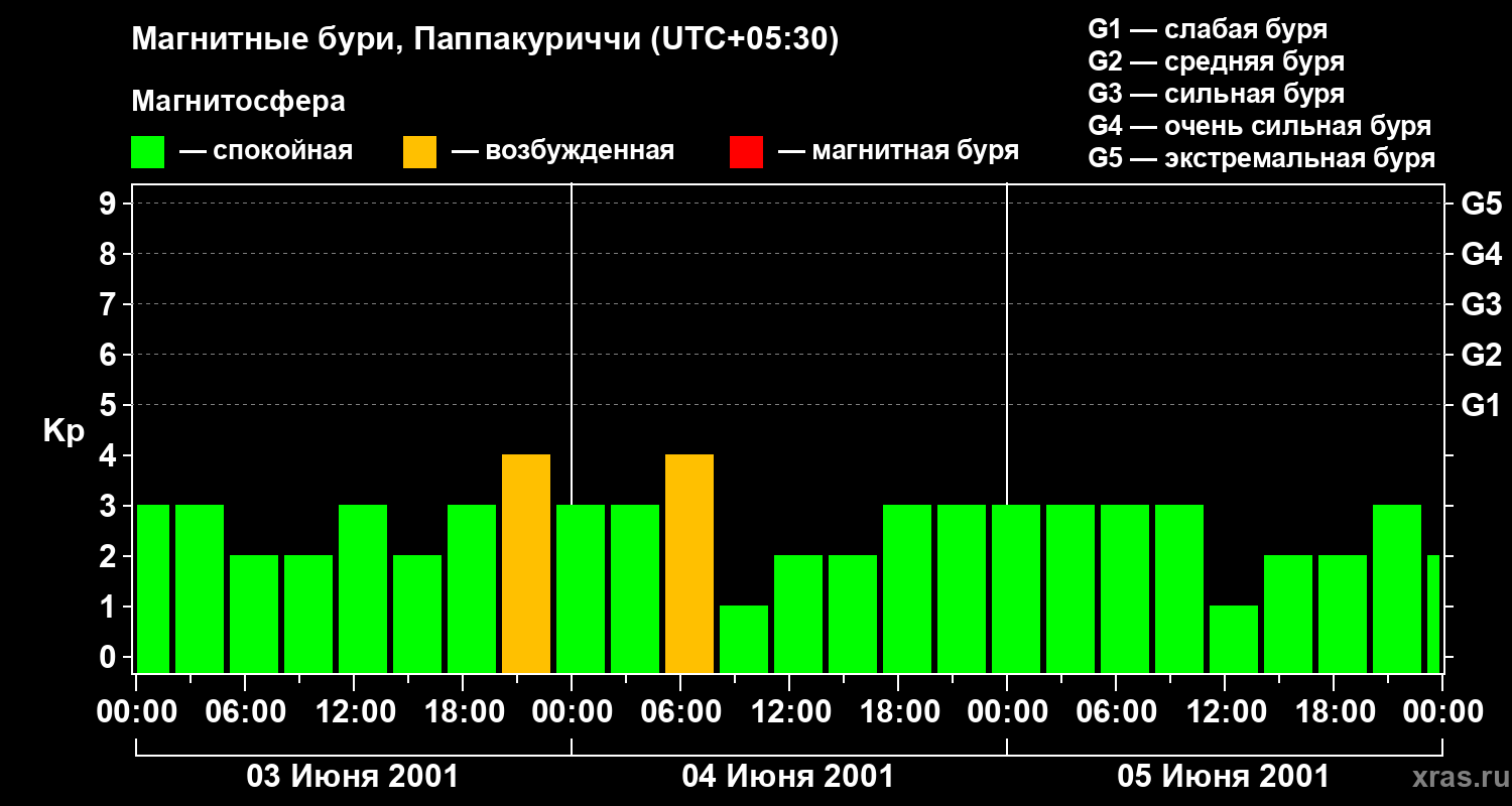 Изменения геомагнитного индекса Kp с 3 по 5 июня 2001 года для средних широт