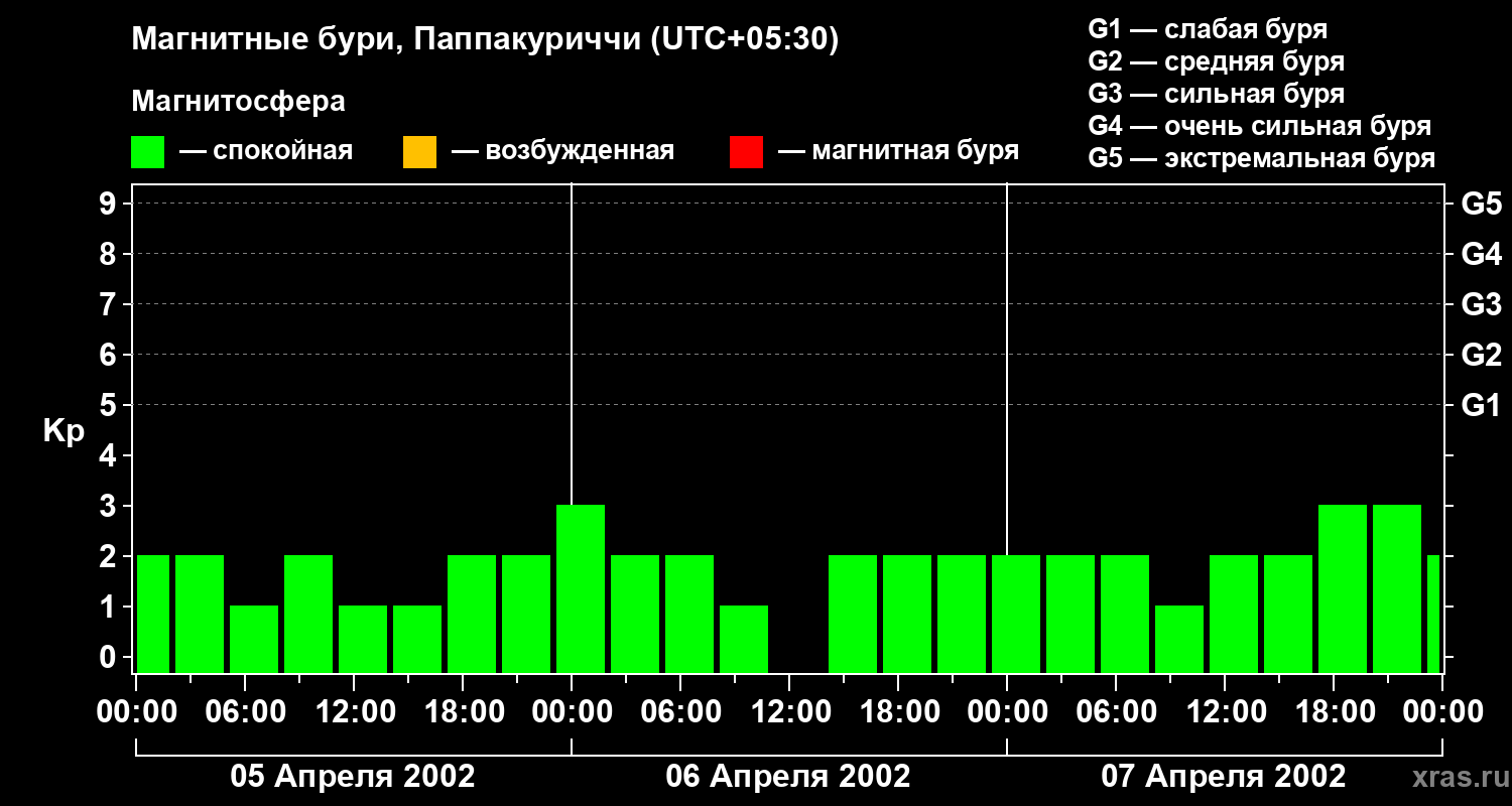 Изменения геомагнитного индекса Kp с 5 по 7 апреля 2002 года для средних широт