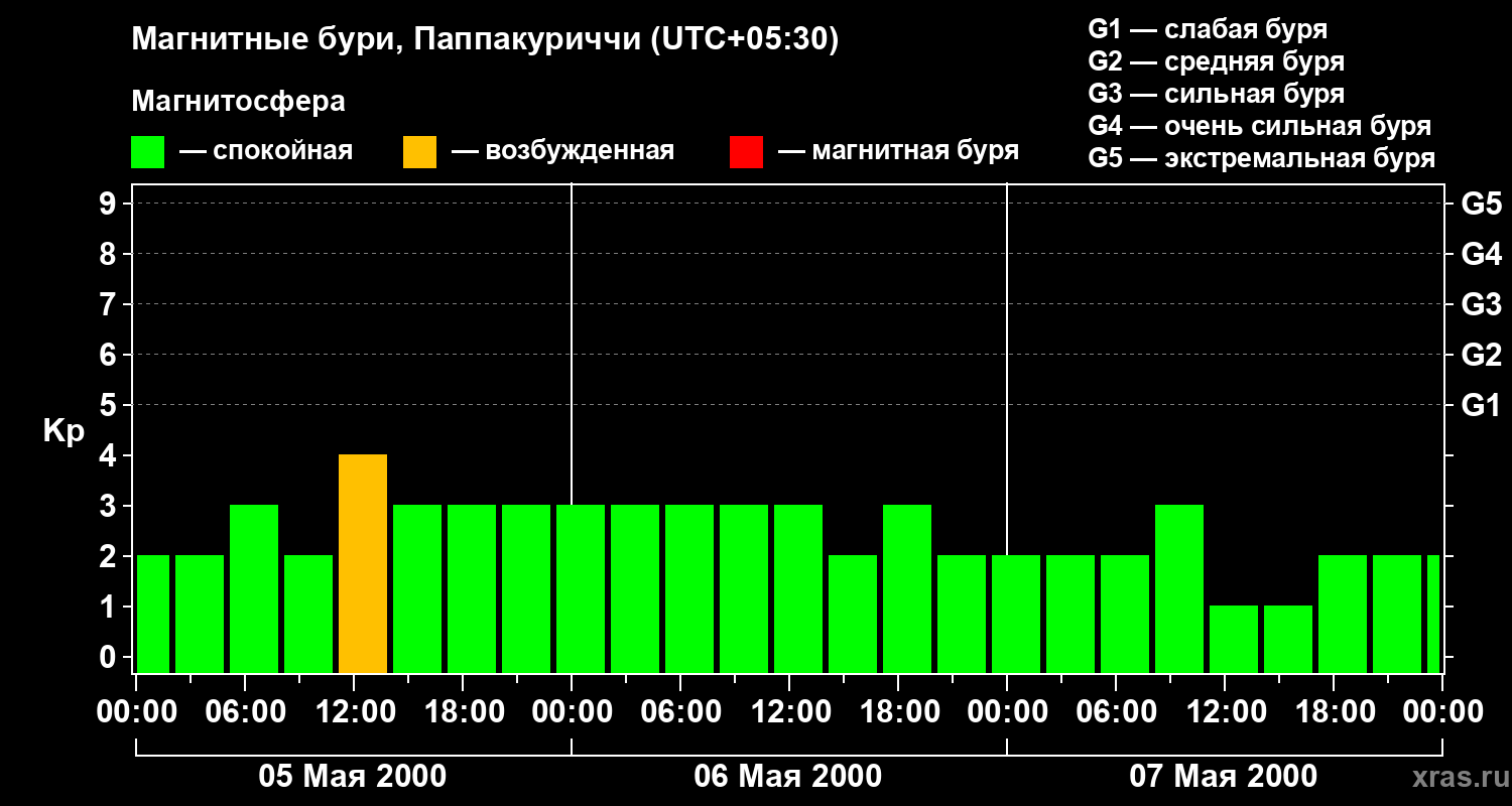Изменения геомагнитного индекса Kp с 5 по 7 мая 2000 года для средних широт