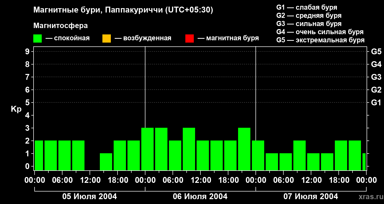 Изменения геомагнитного индекса Kp с 5 по 7 июля 2004 года для средних широт