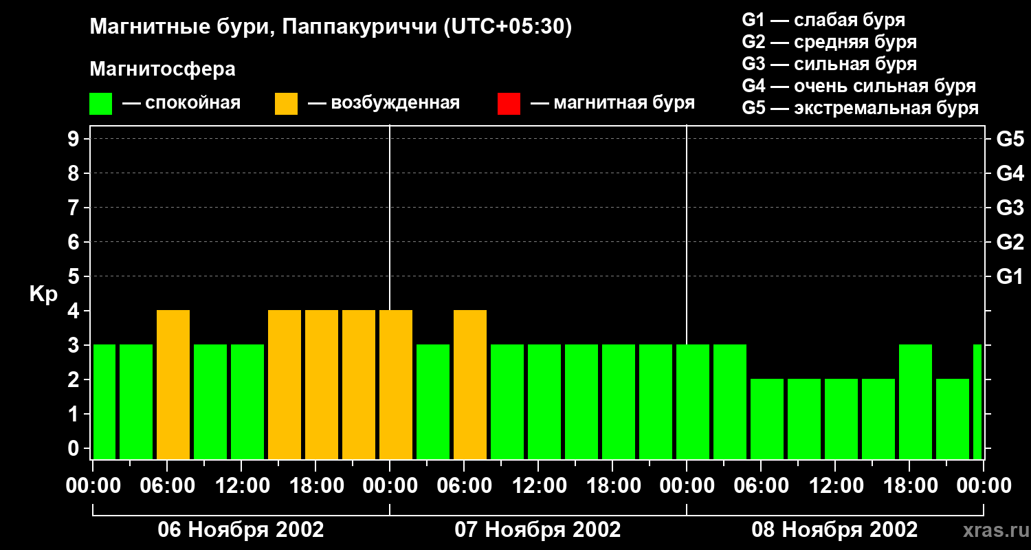 Изменения геомагнитного индекса Kp с 6 по 8 ноября 2002 года для средних широт