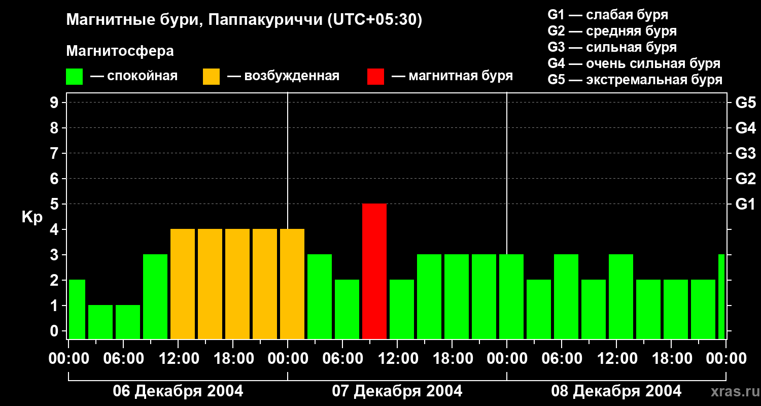 Изменения геомагнитного индекса Kp с 6 по 8 декабря 2004 года для средних широт