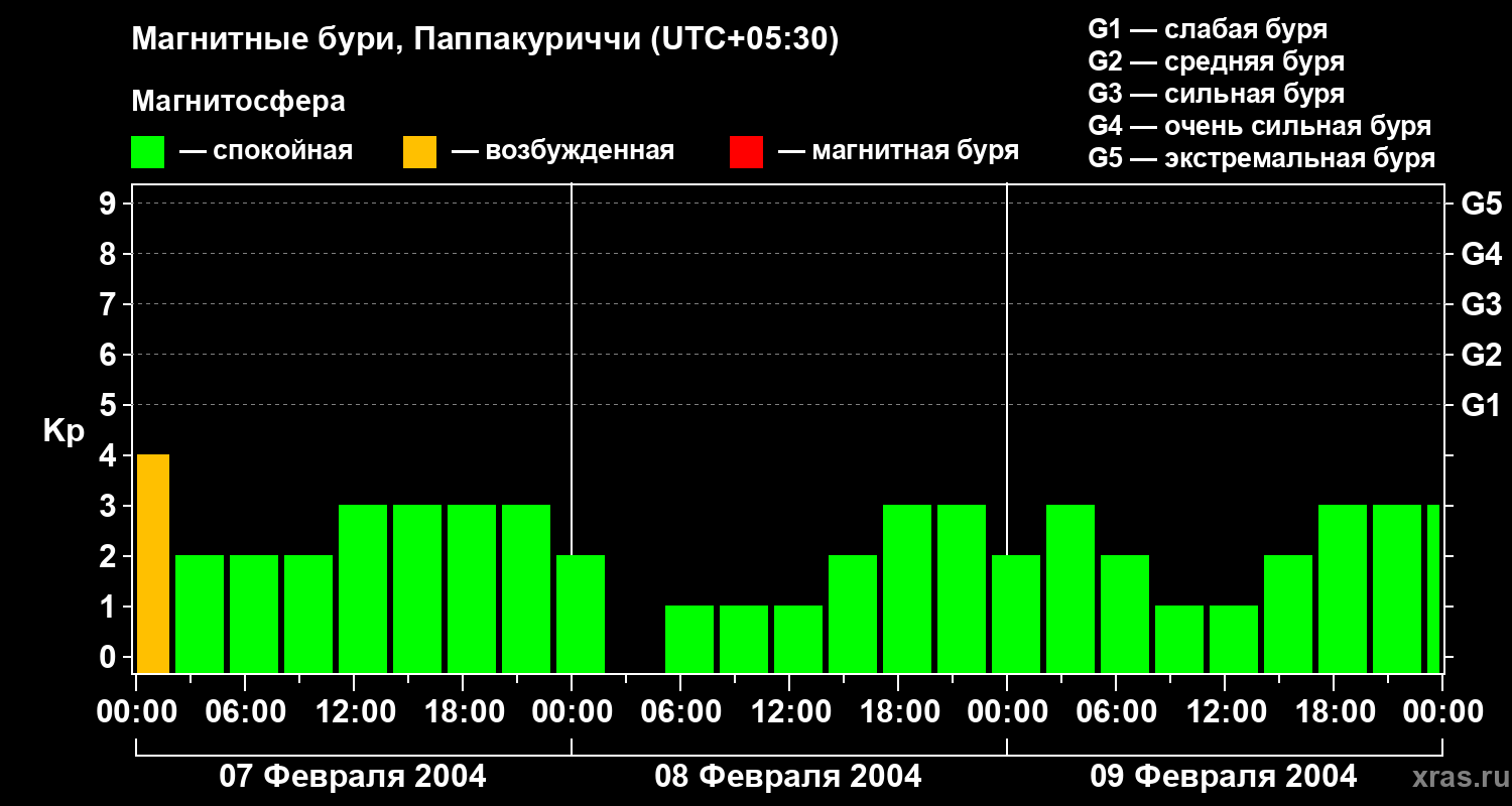 Изменения геомагнитного индекса Kp с 7 по 9 февраля 2004 года для средних широт