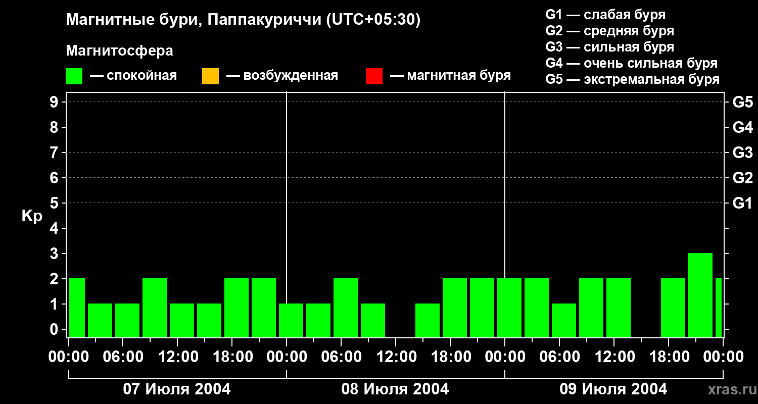 Изменения геомагнитного индекса Kp с 7 по 9 июля 2004 года для средних широт