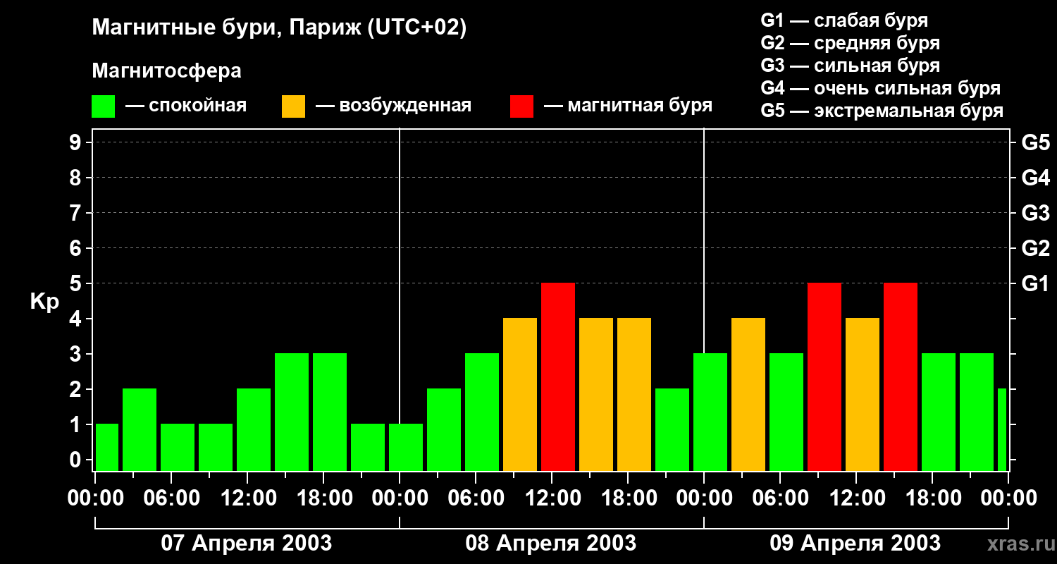 Изменения геомагнитного индекса Kp с 7 по 9 апреля 2003 года для средних широт