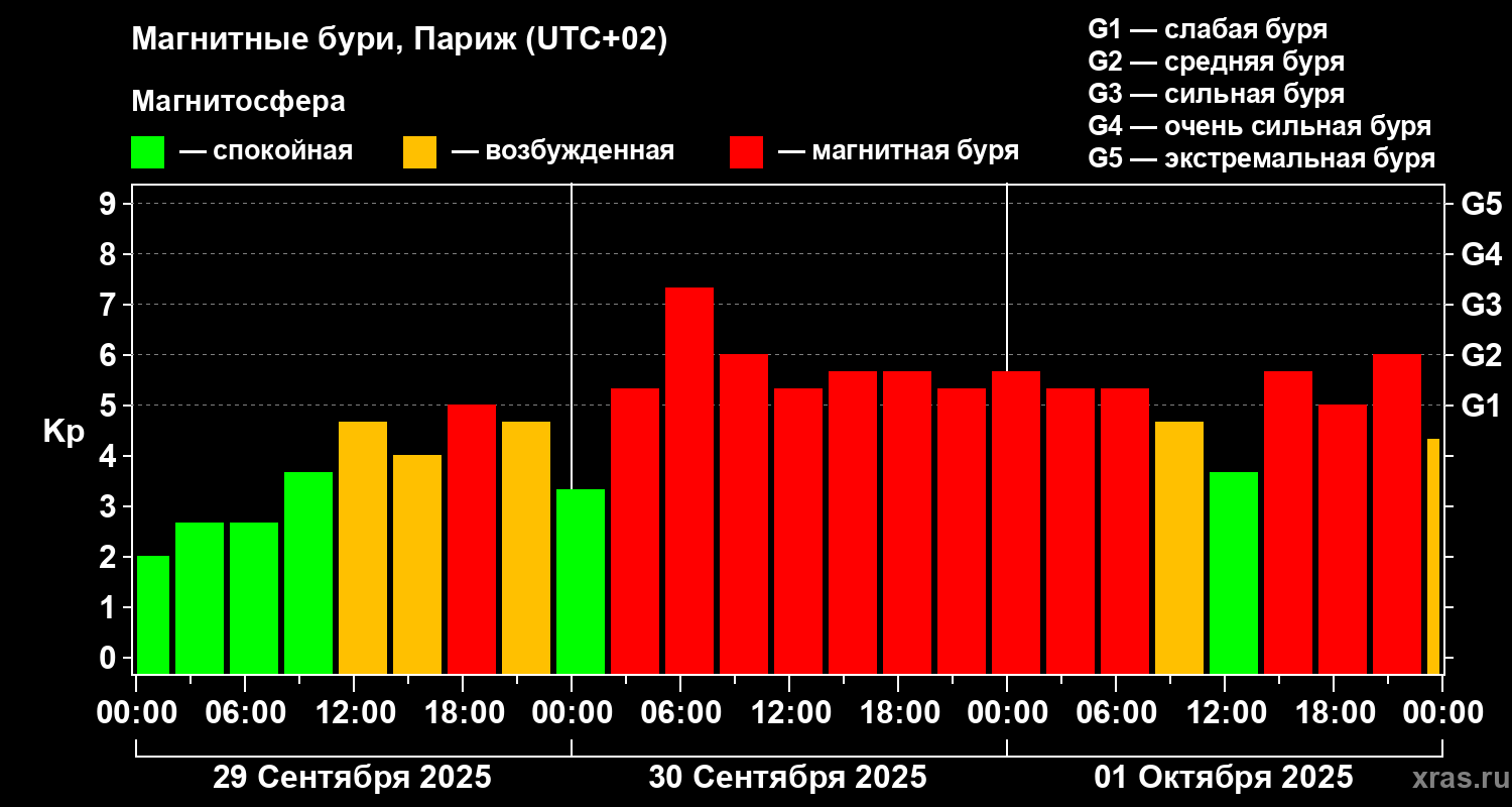 Изменения геомагнитного индекса Kp с 29 сентября по 1 октября 2025 года для средних широт
