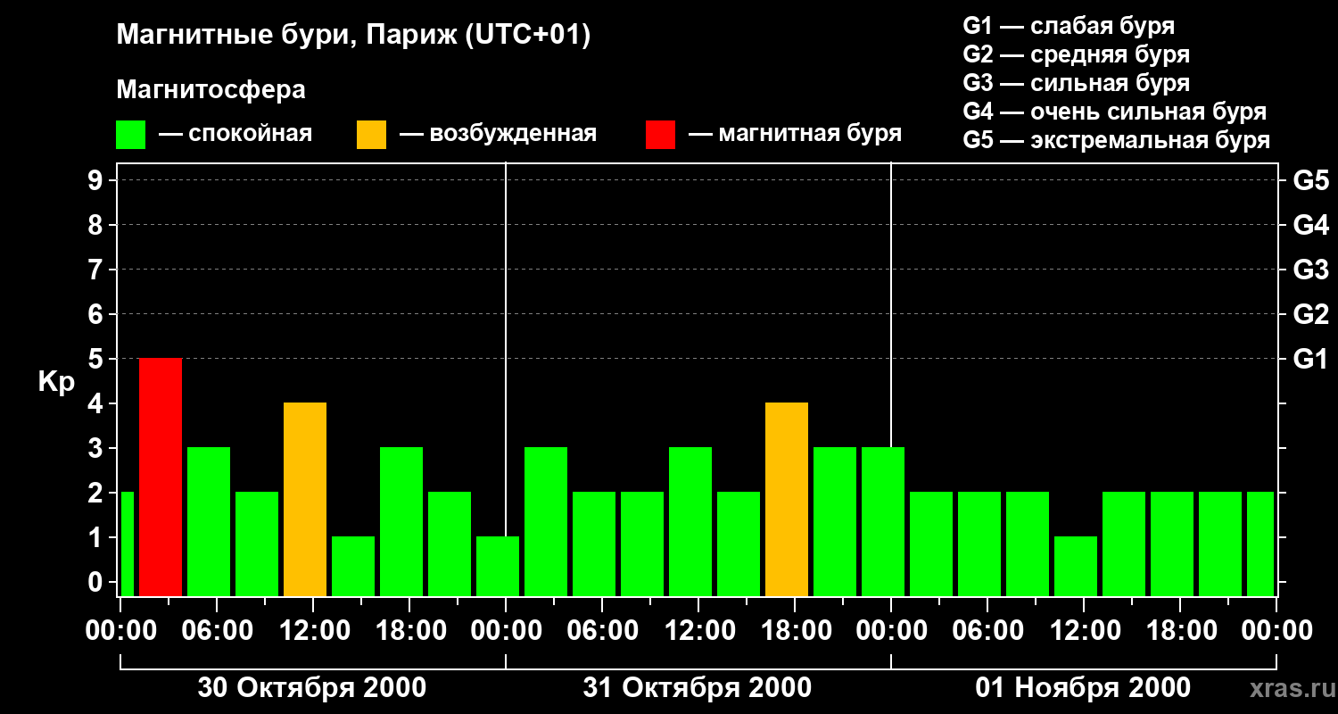 Изменения геомагнитного индекса Kp с 30 октября по 1 ноября 2000 года для средних широт