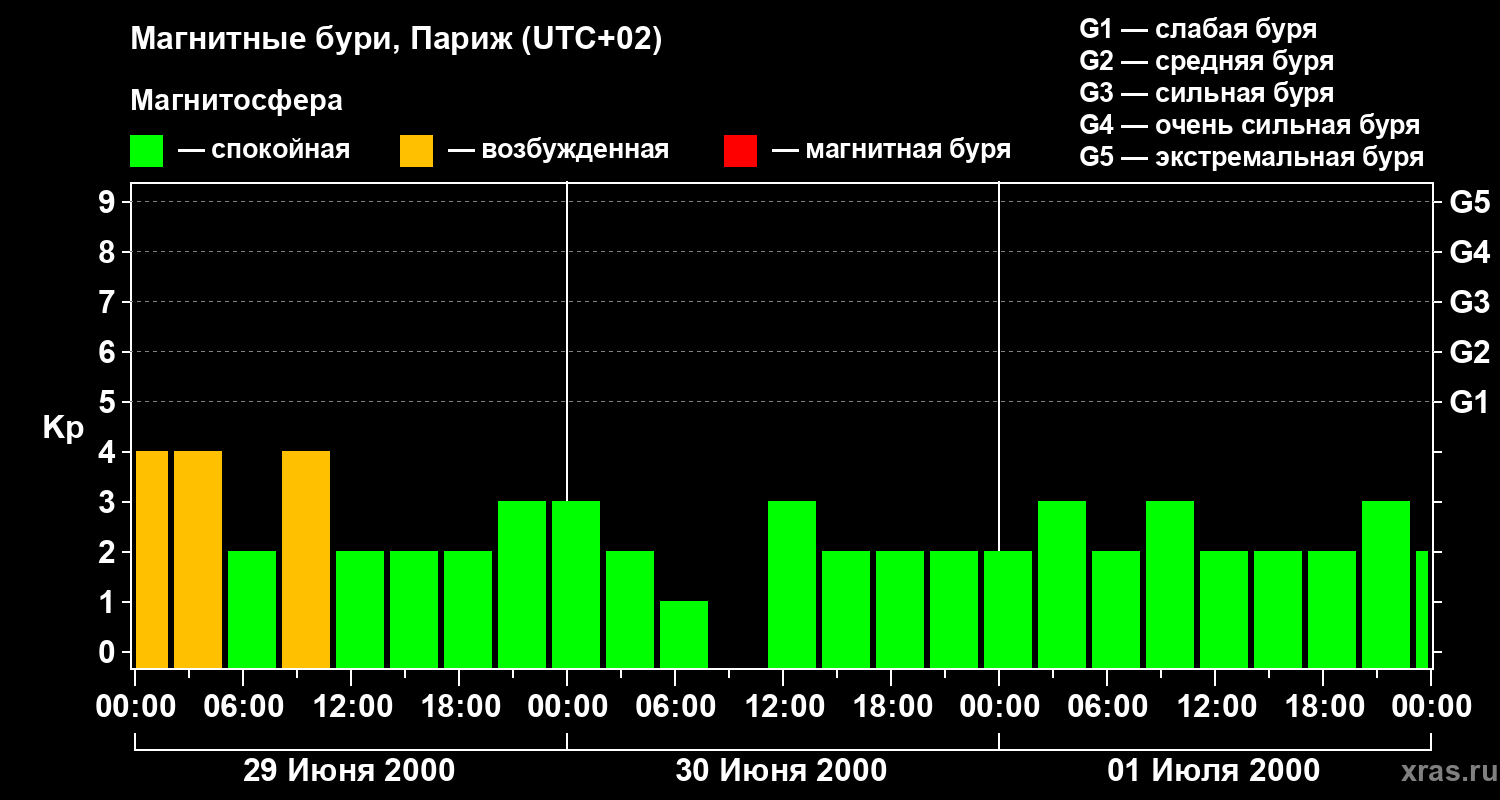 Изменения геомагнитного индекса Kp с 29 июня по 1 июля 2000 года для средних широт