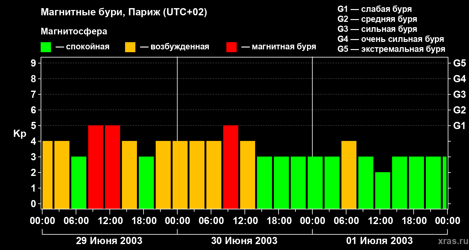 Изменения геомагнитного индекса Kp с 29 июня по 1 июля 2003 года для средних широт