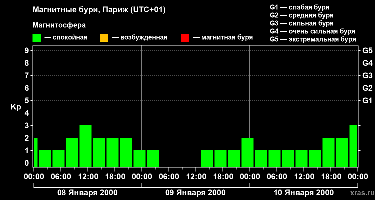 Изменения геомагнитного индекса Kp с 8 по 10 января 2000 года для средних широт