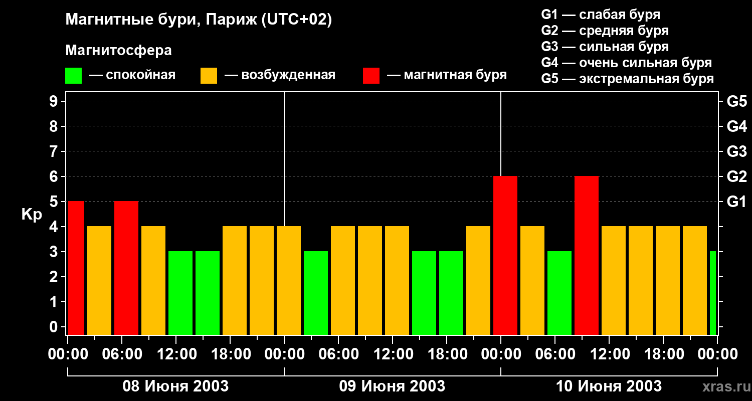 Изменения геомагнитного индекса Kp с 8 по 10 июня 2003 года для средних широт