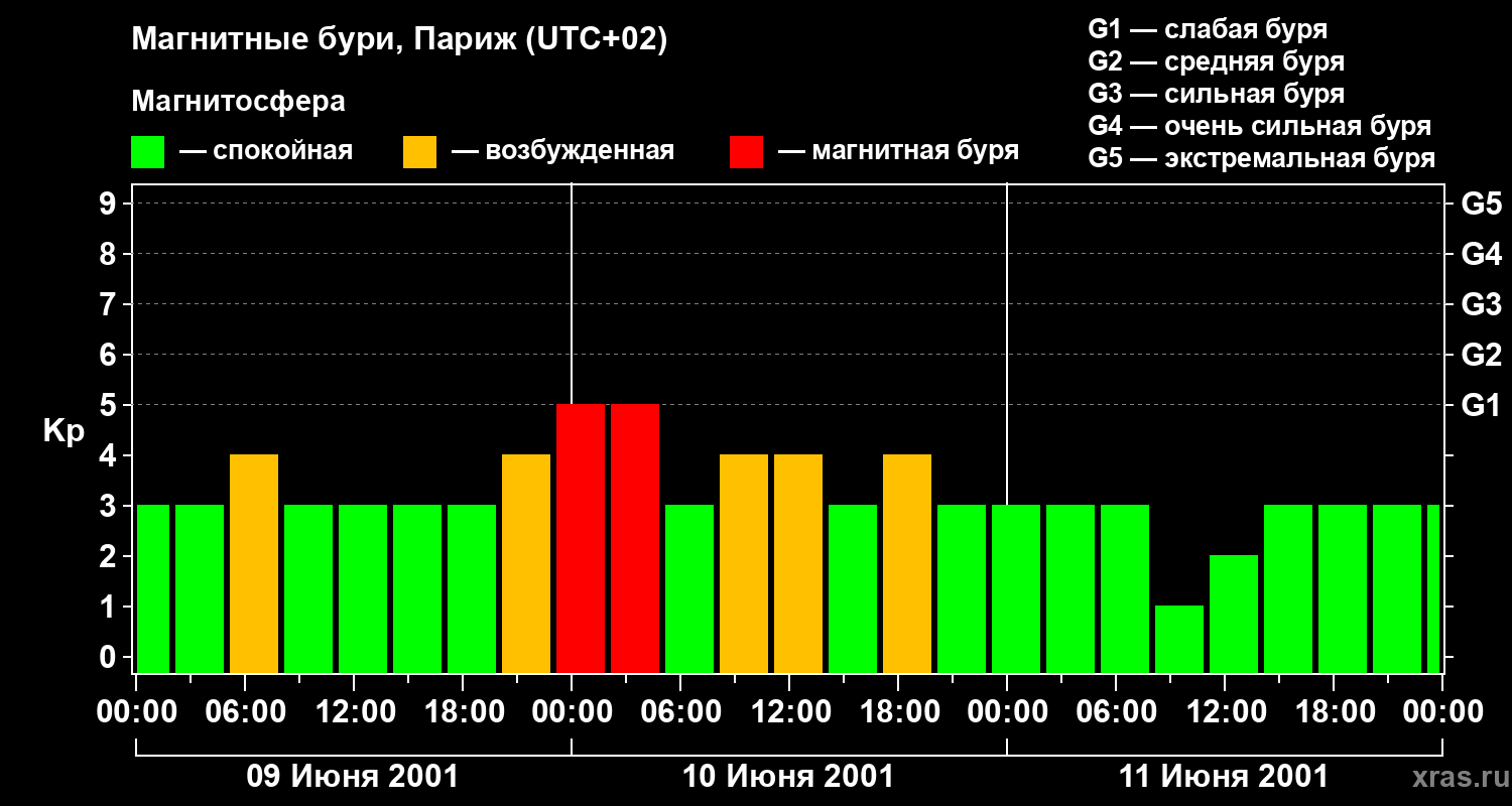 Изменения геомагнитного индекса Kp с 9 по 11 июня 2001 года для средних широт