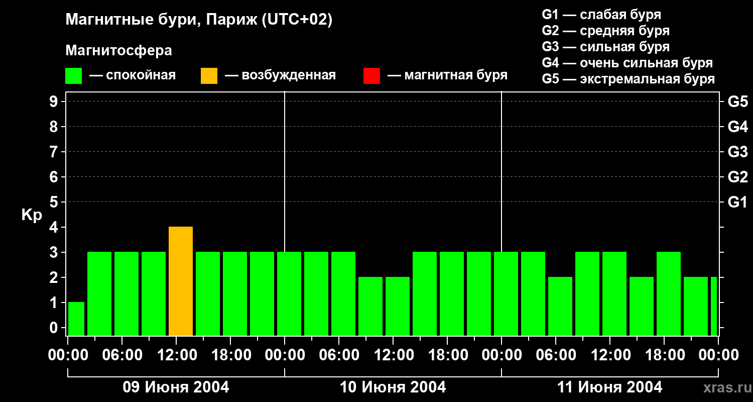 Изменения геомагнитного индекса Kp с 9 по 11 июня 2004 года для средних широт