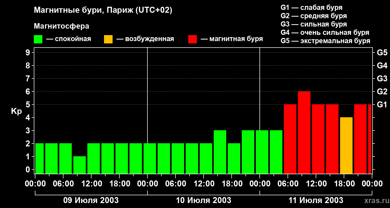Изменения геомагнитного индекса Kp с 9 по 11 июля 2003 года для средних широт