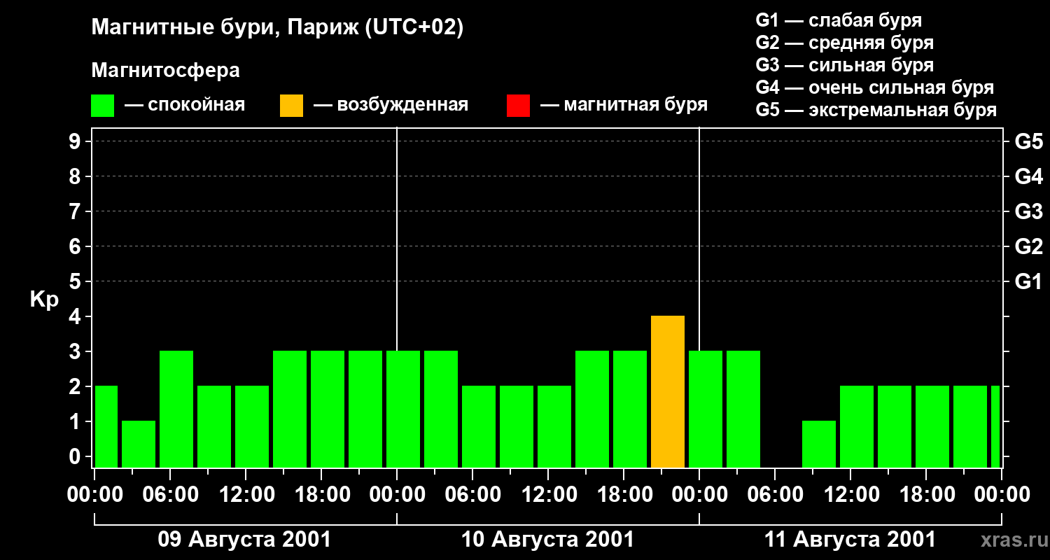 Изменения геомагнитного индекса Kp с 9 по 11 августа 2001 года для средних широт