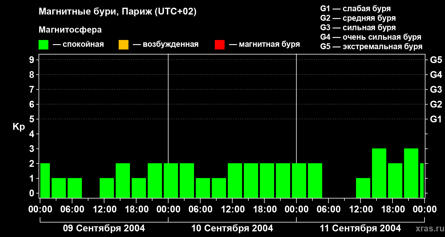 Изменения геомагнитного индекса Kp с 9 по 11 сентября 2004 года для средних широт