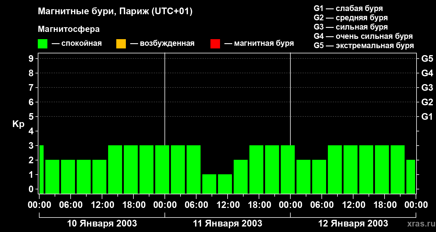 Изменения геомагнитного индекса Kp с 10 по 12 января 2003 года для средних широт
