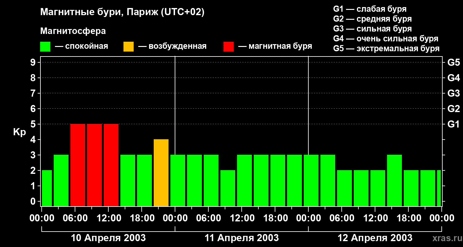 Изменения геомагнитного индекса Kp с 10 по 12 апреля 2003 года для средних широт